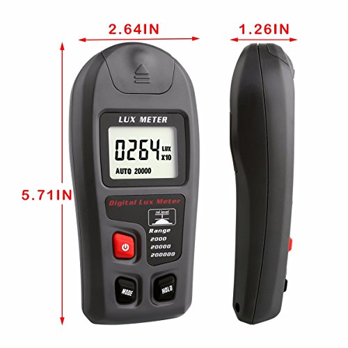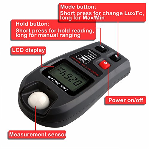 - 解析度:0.1Lux / 0.01Fc、精度:±4%、測定スピード:2回/秒、単位:Lux & Fc。LCDディスプレイ:読みやすい高解像度のLCDディスプレイであり