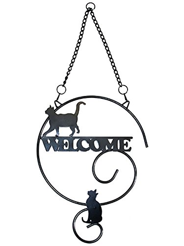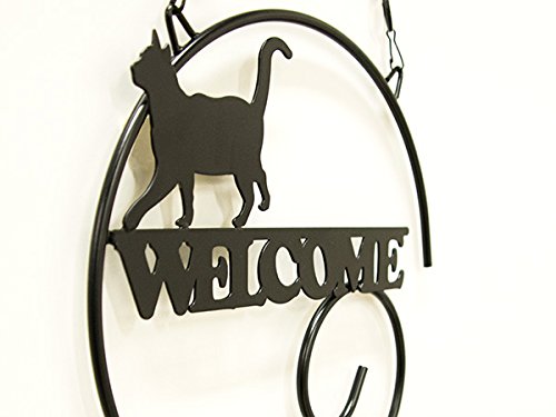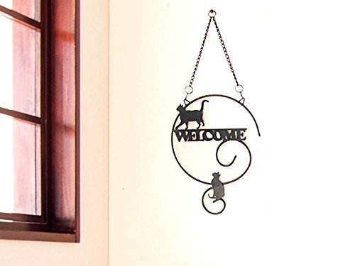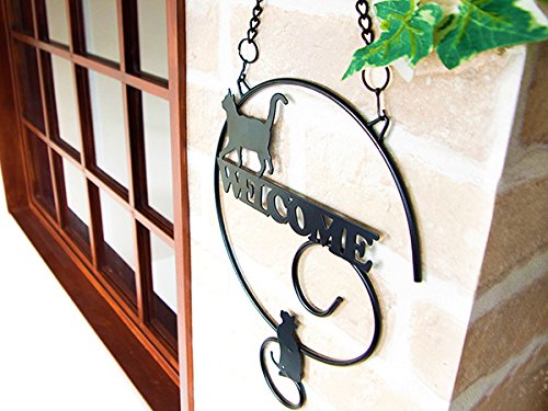 曲線の美しい黒いロートアイアンの上を、気まぐれに歩いたり座ったりしている 猫のシルエットが可愛い、黒猫シリーズの「猫のウェルカムプレート」。