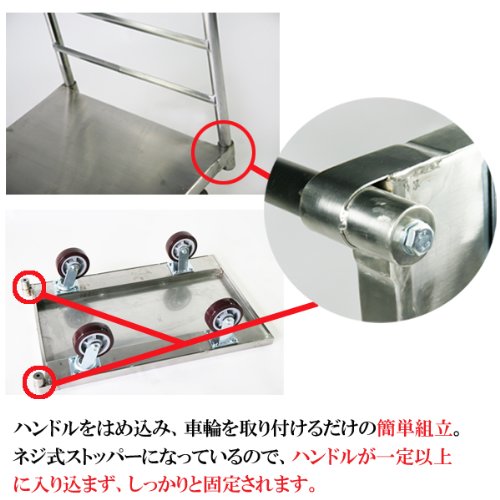 ●車輪とハンドルを取り付けるだけの簡単な組み立て式です。(※ハンドルが入りにくい場合にはゴムハンマーなどを利用してください。※17mmのスパナが必要になります。お客様ご自身で、ご用意してください。)