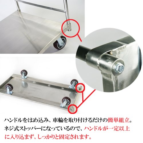 ●車輪とハンドルを取り付けるだけの簡単な組み立て式です。(※ハンドルが入りにくい場合にはゴムハンマーなどを利用してください。※17mmのスパナが必要になります。お客様ご自身で、ご用意してください。)