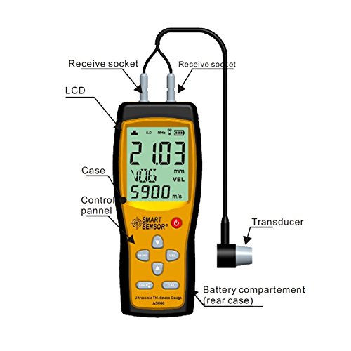 この装置は、厚さの測定部分が2つの平行な表面上で測定される限り、金属、プラスチック、セラミック、ガラスおよび他の良好な材料のような超音波導体を測定するのに適している。