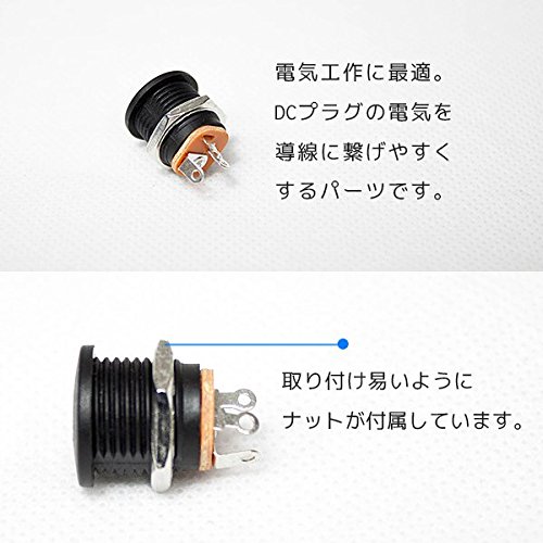 プラス、マイナスの電極にそれぞれ半田付けすればDCジャックの出来上がり。電気製品のDIYに必需品です。汎用性のとても高いパーツです。ナットも付属します。