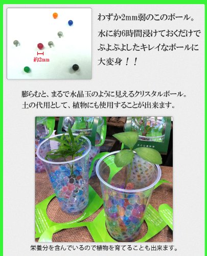 - 【使用方法】顆粒を約500mlの水に入れ、6-8時間浸けておきます。顆粒が水を吸い込み約2cmほどのクリアな球体になります。