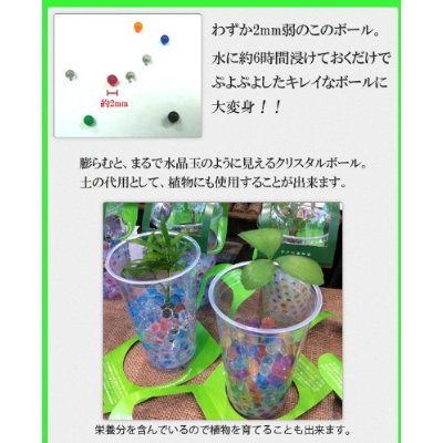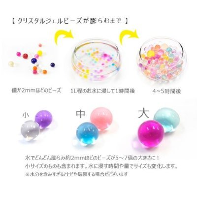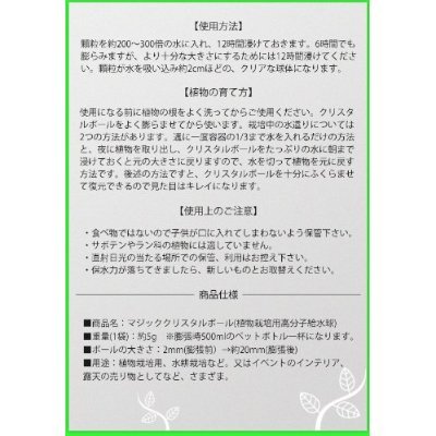 - 【使用方法】顆粒を約500mlの水に入れ、6-8時間浸けておきます。顆粒が水を吸い込み約2cmほどのクリアな球体になります。