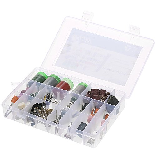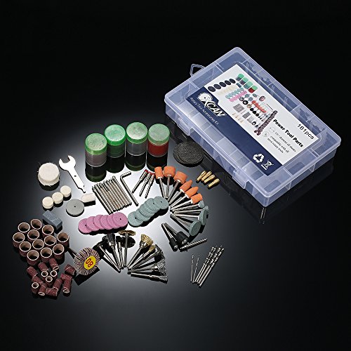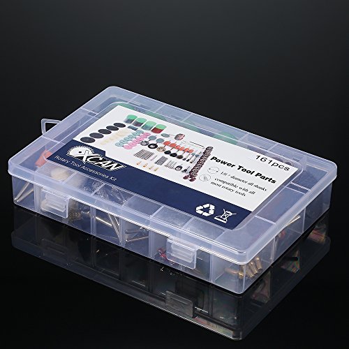 161点の回転ツールアクセサリーキット。切削ディスク、研磨ワックス、ドリルビット、石研磨ホイール、シャンク、砥石、羊毛フェルト、研削針などが含まれています。すべてのタイプのハードとデリケートな素材の細部ワークに最適です。