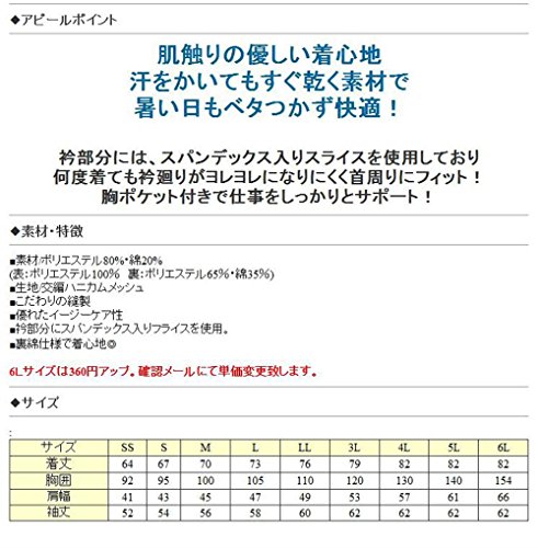 - [特長] ●こだわりの縫製 ●衿部分にスパンディックス入りフライスを使用 ●SS~6Lの豊富なサイズ展開(全9サイズ) ●優れたイージーケア性 ●裏綿仕様で着心地良好