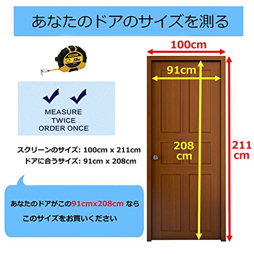 - 【保証とパッケージ内容】品質に自信があるからこそ安心な12ヶ月保証!商品にご満足いただけない場合や不具合等がございましたら、弊社カスタマーサービスへお気軽にお問い合わせくださいませ。パッケージ内容:本体スクリーン(約100 x 211cm)、マジックテープ1巻、補強用の押しピン入り。(適合ドア枠:約91 x 208cm以下) ※ご注文の前にドア枠の寸法をしっかり測り、サイズを間違えないようにお気をつけ下さい。