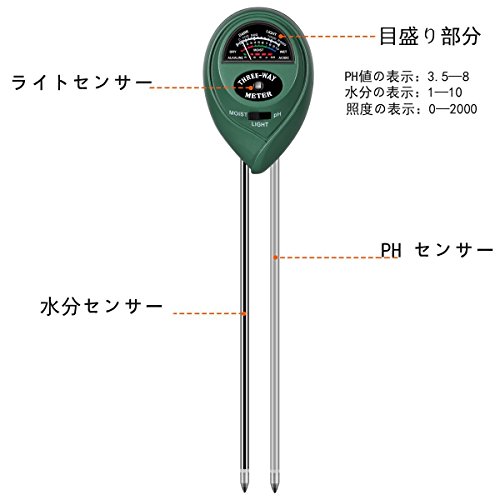 - 【高精度】:PH値の表示:3.5--8、水分の表示:1--10 (ご注意:植物に水を入れる必要があります グリーンエリア:すべてが正常です ブルーエリア:湿度を低減する必要があります)、照度の表示:0--2000。