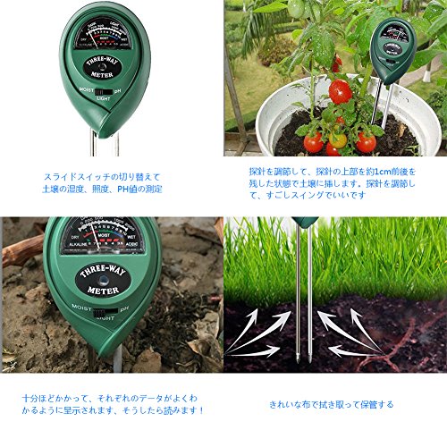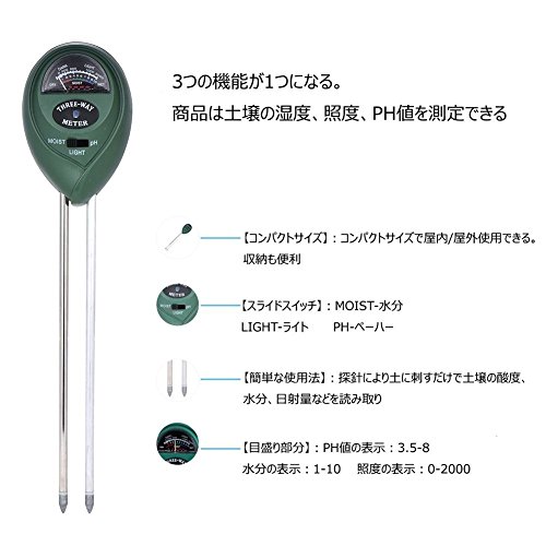 - 【3in1の機能付き】:園芸や農作物の生育管理に最適な土壌酸度計です。スライドスイッチの切り替えて土壌の湿度、照度、PH値の測定ができます