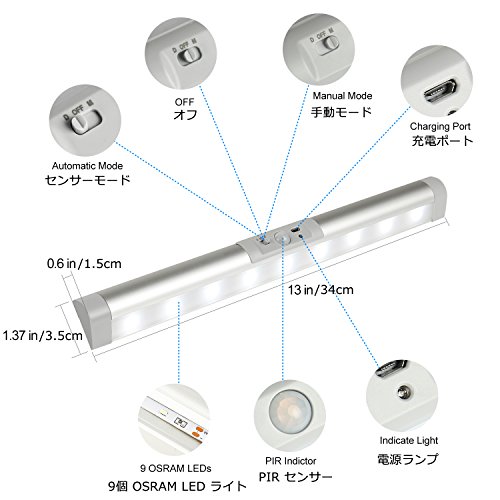 - 【設置簡単】3Mの両面テープと磁石が付属しているので、簡単にお好きな場所に取り付けられます。900mAH内蔵充電式リチウム電池を搭載するので、電源・配線無しで、手間いらないです。取り外しも簡単で懐中電灯としても使用可能。停電時や災害の時にも役に立ちます。