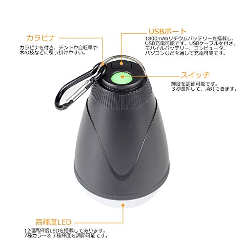 - 【USB充電式&リモコン式】1800mAhリチウムバッテリーを内蔵してあります。USB充電式なので、モバイルバッテリー、コンピュータ、パソコン、ラップトップ、カーチャージャーなどを通して充電可能、繰り返し充電して使用できるのでとっても経済的です。キャンプなどのアウトドアや防災用品として最適です。本製品はリモコンが付き、輝度やカラーを調整に便利です。