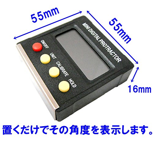 - ■測定範囲 : 0~90°×4象限(360度) ■測定単位 : 0.1° ■作業温度 : 0-40℃ ■相対湿度 : 40-80% ■サイズ : 約55×55×16(mm) (片手に収まるサイズ) ■重量 :48g ■電源 : CR2032×2 (別売) ■付属品 : 取扱説明書(英文)