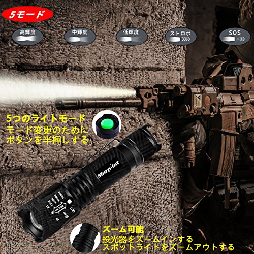 - 懐中電灯:5モード懐中電灯:高輝度、中輝度、低輝度、ストロボ、SOS。スイッチを押してオンにし、半押しでスイッチを押して動作モードを選択します。航空グレードのアルミニウム。防水IPX4。アンチドロップ