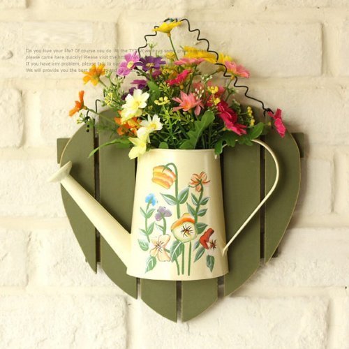 カントリー風 ブリキ じょうろに入った かわいい 壁掛け インテリアフラワー (グリーン系)