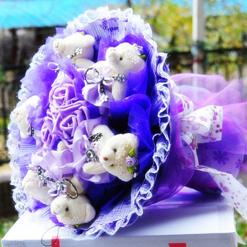 ロマンチック ベア & ローズ かわいい 造花の 花束 パープル プロポーズなどに