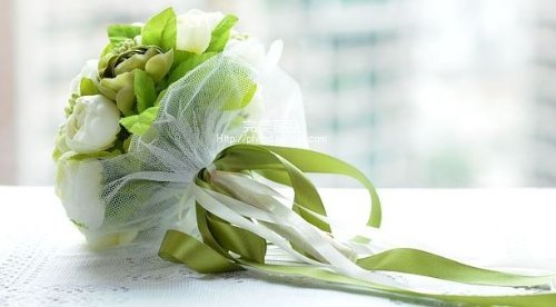 清楚で爽やかなホワイトとグリーンのバラの造花の美しいアートフラワーウェディングブーケです。