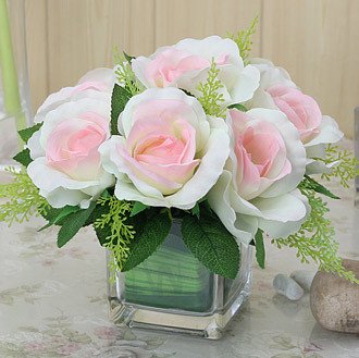 クリアなガラス製ポットに入ったかわいい造花のバラとグリーンのセットです。
