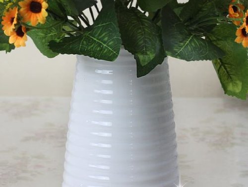 白いポットに入ったかわいい造花のひまわりとグリーンのセットです。