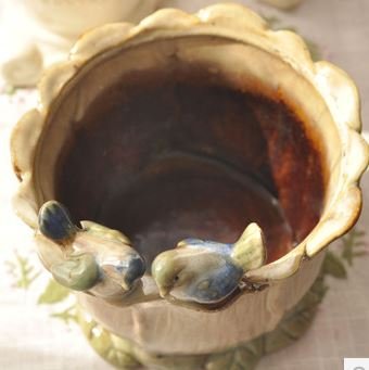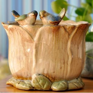 ちょこんと乗った2羽の小鳥さんがとってもかわいい陶器製フラワーポットです。