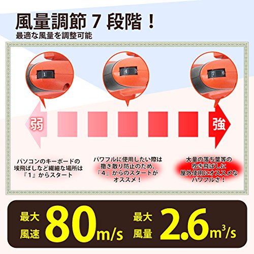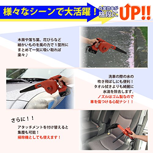 7段階切替のパワフルな充電式ブロワ 小型で軽量だから場所を選ばず使用可能! ・パワフルな風で小さなゴミを吹き飛ばし、1箇所に固めてから吸い込めば作業効率UP!! ・アタッチメントを付け替えれば集塵も可能!車内清掃などにも便利! ・建築現場の木くずや落ち葉、花びら等ほうきで掃除しにくいゴミに有効! ・最大風速80m/sの強力な風が草の間に隠れている落ち葉等をかきだします! ・7段階切替で風量調節を細かく設定。ちょうどいい風量で掃除可能!