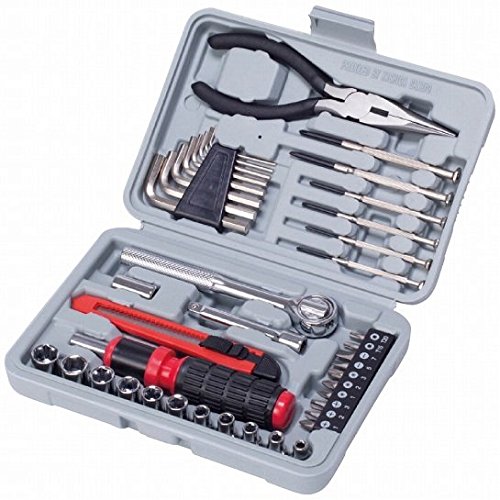 仕様 13×19.5×5cmケース1個・PET・全長13cmビットドライバー・ラジオペンチ・ラチェットハンドル・ソケットアダプター・エクステンションバー・カッターナイフ各1個・六角レンチ8個・精密ドライバー6個・ソケット11個・ビット10個・名入れ方法/ケース蓋:パッド印刷・[中国・台湾製]
