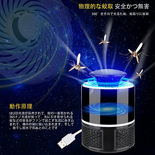 適用範囲 本製品は室内外ともにご使用いただきます。住宅、別荘、庭、バー、マンション、幼稚園、レストラン、カフェ、映画館、養殖場、野外など幅広いとことです。 USB携帯蚊取り器、物理的な方法で蚊取りして、安全無害です。USB 5Vの安全電圧のデザインは高圧電流が避けられ、独特な外見で、分解や収納に簡単だし、洗いやすいし、小型かつ美観です。 本製品-蚊取ライトは物理的な蚊とりで、毒、害、輻射や薬物や化学成分が一切ありません。そのため、蚊とり器を起動させて、すぐに蚊とりは難しいです 動作原理(物理的な蚊取 安全かつ無害) 本製品はLED光源が採用されて、蚊の一番惹かれる365ナノ光波が放って、光に引き寄せられる蚊などの害虫がファンで起こす気流に巻き込まれて、機内の箱に吸い込まれます。そして、陰干し脱水で死ぬとのことです。伝統的な蚊取りに違って、物理的で、匂いや毒や輻射がありません。 製品特徴 * LED光源が採用され、360°全方向で光るため、蚊取りに抜群。 * USB電源の携帯蚊取りライト、PCやノートパソコンやUSBポートの設備などとつながるため、高圧電流漏れの恐れが避けられ、室内外ともにご使用いただけます。 * 蚊などの害虫が逃げられないデザイン、虫たちは入るが逃げられなくて、一網打尽。 * 高効率かつ省エネ、マナーモードのデザイン:蚊取りが静かで、匂いがしないので、安らかに寝ていただけます。 * 室内で1Mぐらいの高さに置いていただければ、より効果的です 【製品仕様】 商品サイズ:120×180mm 本体質量:約350g 材質:ABS USBケープル長さ:約100cm 消費電力:5W 参考有効面積:20-50平方メートル【セット内容】 蚊とり器×1 NuSense日本語取扱説明書×1 蚊取りライトについて 寝室でご使用の際、必ずあらかじめ起動すること(少なくとも3時間前)寝るとき起動するのはご遠慮いただきます。 1、はじめてご使用の際、三日から五日間続いて起動させてください。お昼のとき、ドアや窓を閉めて、蚊取り器を寝室に置いて、寝室を暗くしてください、寝るときは、蚊取り器をリビングやトイレやキッチンに置いてください。(寝室に侵入させないため、そこに置く。そのような場所には蚊が多い) 2、できれば、1mの高さのところに置いてください。ライトをつかないこと。ドアや窓を開かないこと。扇風機やエアコンの送風口に置かないこと。 3、蚊取り器のライトが唯一の光源でよりいい効果が出るには、、他のライトを消してください。 4、ご使用の7日後、蚊取り箱を取り出していただけます。物理的な蚊取りなので、頻繁に箱を開けると、未陰干しの蚊が逃げることがあります。その場合、引き続き3時間起動させて蚊を陰干ししてください。もし蚊取り効果をご覧になる場合、室外に移っていただきます。