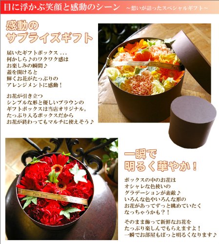 ●お届け地域・・・本州・四国のみ ※北海道・九州・沖縄県及び2日以上かかる地域へのお届け不可。 当店(長野)から発送後、お届けに2日以上かかるので商品の性質上お届けできません。 ●お届け日指定・・・ご注文日の翌日以降指定可能。 ※ご注文日の14時以降は翌日扱いとなります。 ※ご指定がない場合には入金確認後、最短でお届け致します。 ●蓋を開けた瞬間の感動を♪ ギフトボックスにお花を詰め込んだサプライズギフトです! グラデーションの色使いがオシャレ♪定番のアレンジじゃ物足りない方には超お勧め!