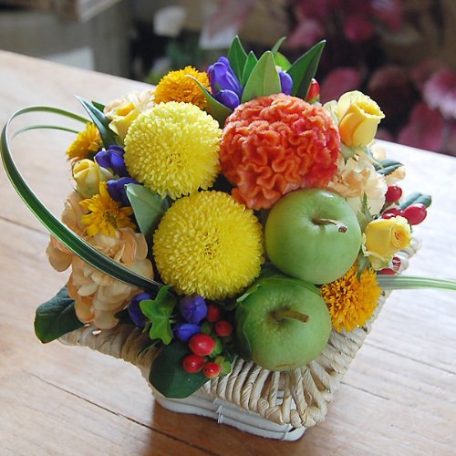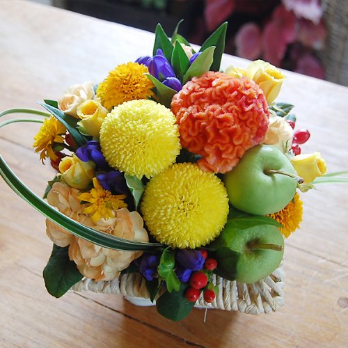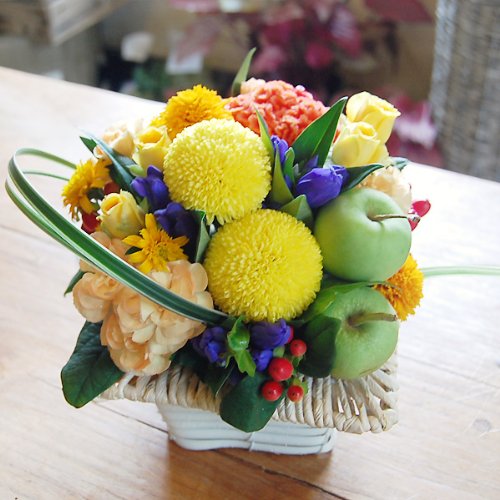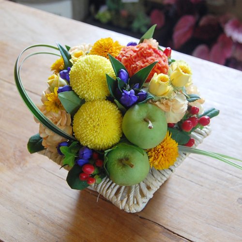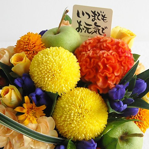 敬老の日にフレッシュなフラワーアレンジメントをどうぞ♪ 人気のリンドウと丸いポンポン菊をメインに秋のお花やリンゴ、そしてバラが入っているスタイリッシュなフラワーアレンジメントです。 秋のいろどりにパッと華やかな演出をします。 器は四角いベースで定番とは違った楽しみがあります。 農林水産大臣賞受賞経歴をもつデザイナーが敬老の日のためにアレンジしたのでセンス抜群です。 ひとつひとつ丁寧に手作業で心をこめて制作しています。 保水スポンジにアレンジしてあるので花瓶がいりません。届いてそのまま飾れるので気軽にプレゼントできます。 毎日お水を足してしばらくはお楽しみいただけます。 敬老の日ギフトに是非どうぞ!