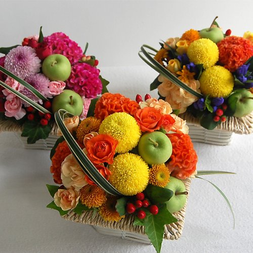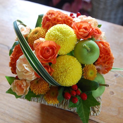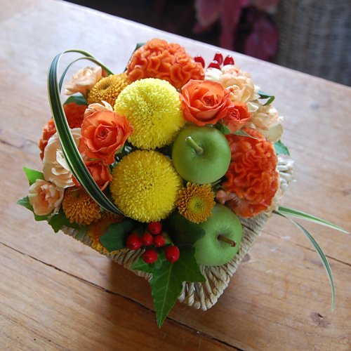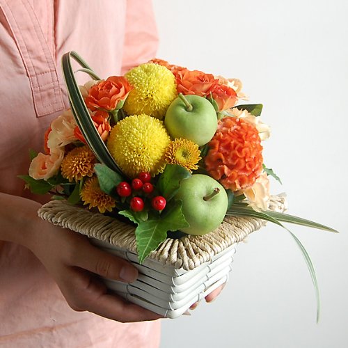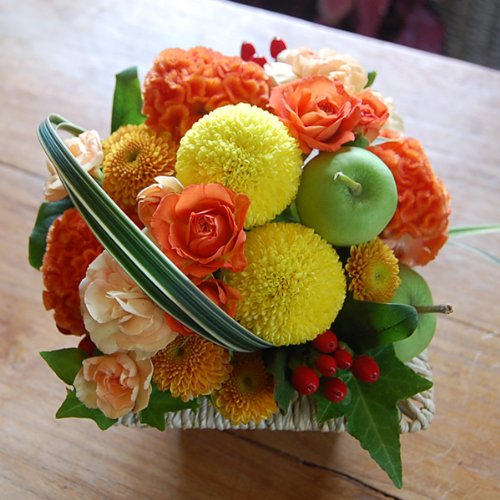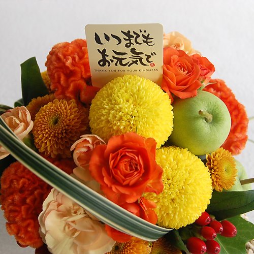 敬老の日にフレッシュなフラワーアレンジメントをどうぞ♪ 人気の丸いポンポン菊をメインに秋のお花やリンゴ、そしてバラが入っているスタイリッシュなフラワーアレンジメントです。 秋のいろどりにパッと華やかな演出をします。 器は四角いベースで定番とは違った楽しみがあります。 農林水産大臣賞受賞経歴をもつデザイナーが敬老の日のためにアレンジしたのでセンス抜群です。 ひとつひとつ丁寧に手作業で心をこめて制作しています。 保水スポンジにアレンジしてあるので花瓶がいりません。届いてそのまま飾れるので気軽にプレゼントできます。 毎日お水を足してしばらくはお楽しみいただけます。 敬老の日ギフトに是非どうぞ!