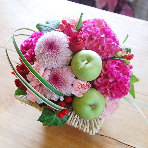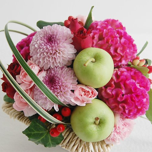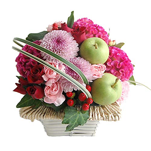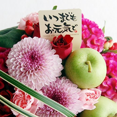敬老の日にフレッシュなフラワーアレンジメントをどうぞ♪ 人気の丸いポンポン菊をメインに秋のお花やリンゴ、そしてバラが入っているスタイリッシュなフラワーアレンジメントです。 秋のいろどりにパッと華やかな演出をします。 器は四角いベースで定番とは違った楽しみがあります。 農林水産大臣賞受賞経歴をもつデザイナーが敬老の日のためにアレンジしたのでセンス抜群です。 ひとつひとつ丁寧に手作業で心をこめて制作しています。 保水スポンジにアレンジしてあるので花瓶がいりません。届いてそのまま飾れるので気軽にプレゼントできます。 毎日お水を足してしばらくはお楽しみいただけます。 敬老の日ギフトに是非どうぞ!
