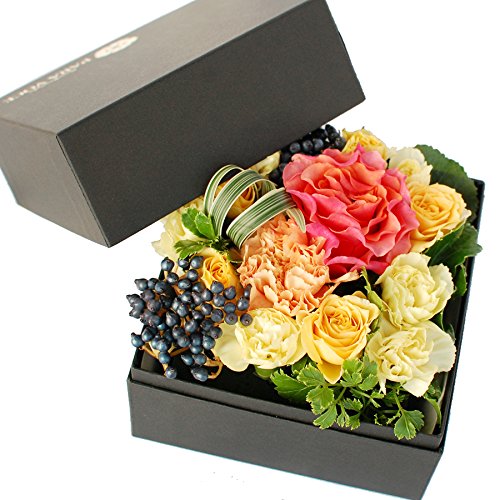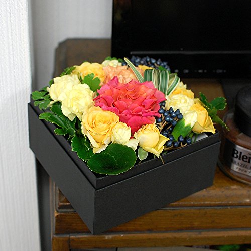 たくさんの花材を使用しお客様に満足いただける商品をお届けいたします。ブラックボックスに黄色やオレンジのお花・葉物で見栄え良くアレンジしました。 縦13cm x 横13cm x 高さ10.5cm 【お花専用ギフトボックスでお届け】 フラワーギフトを美しい状態でお届けするために、配送中にも『この中にはお花が入っています』ということをアピールして、丁寧に扱ってもらうようにしています。 ★パラボッセのこだわり★4保水スポンジで給水するから新鮮なままお届け。お花の元気のもととなる水分。パラボッセのアレンジには1級品の保水スポンジを使用しています。お届けするまでの間、水切れの心配がなく、安心して届いたお花を楽しめます。
