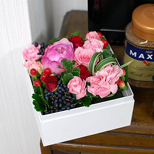 たくさんの花材を使用しお客様に満足いただける商品をお届けいたします。ホワイトボックスにピンクやレッドのお花・葉物で見栄え良くアレンジしました。 縦13cm x 横13cm x 高さ10.5cm 【お花専用ギフトボックスでお届け】 フラワーギフトを美しい状態でお届けするために、配送中にも『この中にはお花が入っています』ということをアピールして、丁寧に扱ってもらうようにしています。 ★パラボッセのこだわり★4保水スポンジで給水するから新鮮なままお届け。お花の元気のもととなる水分。パラボッセのアレンジには1級品の保水スポンジを使用しています。お届けするまでの間、水切れの心配がなく、安心して届いたお花を楽しめます。