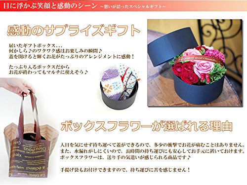 バラをメインにアレンジしたフラワーボックス。大輪の花材を使用しているのでボリューム満点!ボックス型のフラワーアレンジメントは、プレゼントされた時の感動もひとしお。いつまでも心に残るフラワーギフトとなります。笑顔と感動を届けます! 【お花専用ギフトボックスでお届け】 フラワーギフトを美しい状態でお届けするために、配送中にも『この中にはお花が入っています』ということをアピールして、丁寧に扱ってもらうようにしています。 ★パラボッセのこだわり★1新鮮な花材を使用。なるべく大輪なお花を選んでいるのでボリュームが違います。★2シンプル&オシャレなラッピング。箱から出した瞬間、色鮮やかさが目をひきます!★3メッセージはひと目で伝わる場所に。★4保水スポンジで給水するから新鮮なままお届け。お花の元気のもととなる水分。パラボッセのアレンジには1級品の保水スポンジを使用しています。お届けするまでの間、水切れの心配がなく、安心して届いたお花を楽しめます。