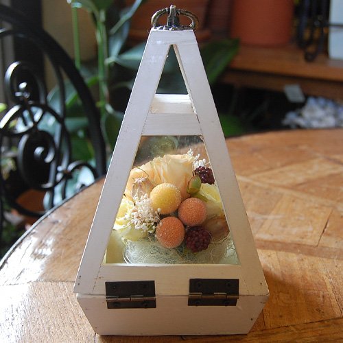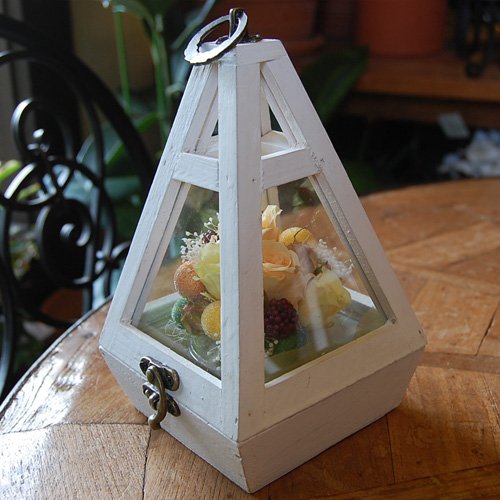 枯れずに長く楽しめるプリザーブドフラワーを木枠ガラスフレームにアレンジしました。アンティーク調のケースは唯一当店オリジナル商品でこだわりのデザインです。バラとフェイクベリーの組み合わせがかわいらしいアレンジは農林水産大臣賞受賞経歴をもつデザイナーが担当しました。ひとつひとつ丁寧に手作業で心をこめて制作しています。ガラスケース入りなので、ホコリの心配もなく長くお楽しみいただけるお花です。