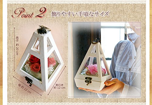 枯れずに長く楽しめるプリザーブドフラワーを木枠ガラスフレームにアレンジしました。アンティーク調のケースは唯一当店オリジナル商品でこだわりのデザインです。バラとフェイクベリーの組み合わせがかわいらしいアレンジは農林水産大臣賞受賞経歴をもつデザイナーが担当しました。ひとつひとつ丁寧に手作業で心をこめて制作しています。ガラスケース入りなので、ホコリの心配もなく長くお楽しみいただけるお花です。