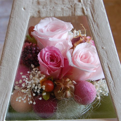 枯れずに長く楽しめるプリザーブドフラワーを木枠ガラスフレームにアレンジしました。アンティーク調のケースは唯一当店オリジナル商品でこだわりのデザインです。バラとフェイクベリーの組み合わせがかわいらしいアレンジは農林水産大臣賞受賞経歴をもつデザイナーが担当しました。ひとつひとつ丁寧に手作業で心をこめて制作しています。ガラスケース入りなので、ホコリの心配もなく長くお楽しみいただけるお花です。