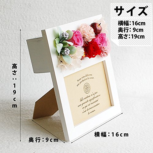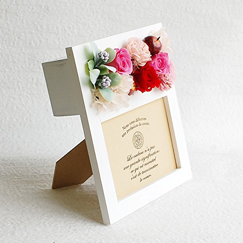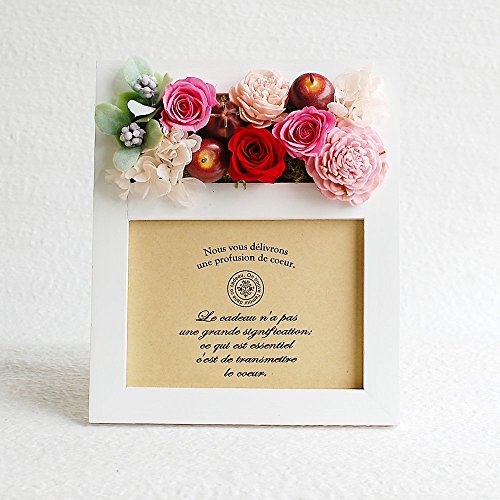枯れずに長く楽しめるプリザーブドフラワーをアレンジした写真たてです。 L版の写真をセットできます。カバーはプラスチック製です。優しいピンクの色使いがオシャレで、フェイクアップルがアクセントになり飽きのこないデザインです。 農林水産大臣賞受賞経歴をもつデザイナーがアレンジし、ひとつひとつ丁寧に手作業で心をこめて制作しています。 記念に残る写真と一緒にギフトでプレゼントしたり、ご自宅用にも手ごろなサイズでぴったりです。