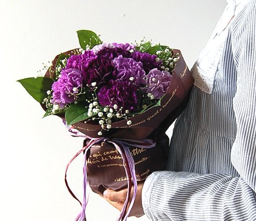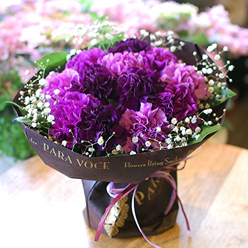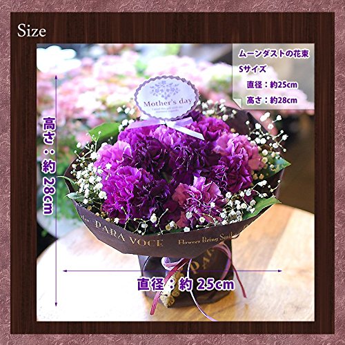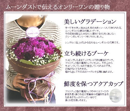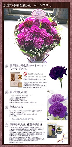 この花束は中にアクアカップがありしっかり保水されているので、花瓶の心配がいりません。届いたそのままを飾ってお楽しみいただけます。 直射日光を避け、できるだけ涼しいところに置いていただくと長くお楽しみいただけます。 世界で唯一の青いカーネーション「ムーンダスト」 「母の日」の定番の花・カーネーション。中でも、世界で唯一の青いカーネーション“ムーンダスト”が、今話題です。すべてを優しく包み込む、まるで月の光のような上品なブルーは、慈しみに満ちたお母さんにぴったり。誰よりも大切な存在であるお母さんに、特別なカーネーションを贈ってみてはいかがでしょうか。 大切な人に贈りたい幸せの花。花言葉は「永遠の幸福」 “ムーンダスト”という名前には、『月のようにやわらかな包容力のある花に』との想いが込められています。月の光のように華麗な花びらが永遠の幸福をもらたすようにと、あなたとあなたの大切な人の人生を見守ります。 「届いて10日過ぎましたがお花がまだキレイに咲いています!」とお母さんの喜びのお電話に私もお客様と一緒に幸せを感じています。 ムーンダストは独特の色合いだけでなく、長持ちする品質の良さも自慢になるお花ですよ。 美しい3色のグラデーションミックスです。上品な色合いは玄関先に飾っていただいたり、リビング、ダイニングなどどこに飾ってもひときわ目をひきます。