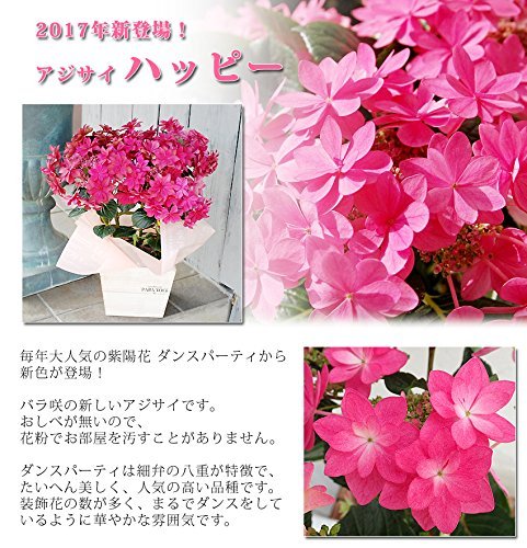 アジサイ ダンスパーティー・ハッピーの鉢植えです。ガクアジサイの園芸品種で淡いピンクの装飾花が踊っているようにステキです。ボリュームがあるのでギフトとして人気があります。 年間を通して半日陰の場所で育てます。とても水を欲しがるので水切れに注意してマメに水やりをしましょう。庭植え推奨です。水切れ予防にもなります。 ★花市場を通して正規のルートで入手しているので安心の品質です。見た目に華やかなボリュームのある5号鉢サイズをご用意しました。鉢カバー付だから見た目もオシャレ。お水が漏れる心配がないから飾る場所を選びません。テーブルやフローリングなど、どの空間も華やかに演出します。 母の日の新定番となりつつあるアジサイ ダンスパーティーは最安値挑戦のパラボッセで是非お求めください!