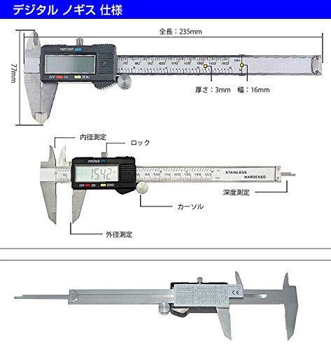 - ◆ 測定範囲:0~150(mm) ◆ 誤差:±0.05ミリメートル ◆ 測定:外径測定、内径測定、深さ測定、段差測定、比較測定、間接測定 ◆ 付属品 ・ ケース:ABS プラスチックケース ・ 電池(LR44 ボタン電池) ・ 説明書(英語)
