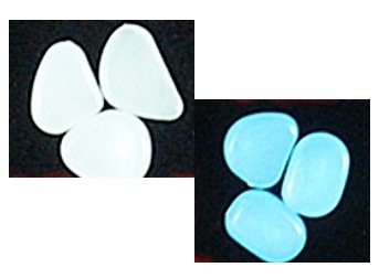 光 を 蓄積 して 暗所 で 光る 夜光石です。プランター や 庭 の花壇など、 歩道、ガーデニング のかざりや 防犯 の 砂利 として。