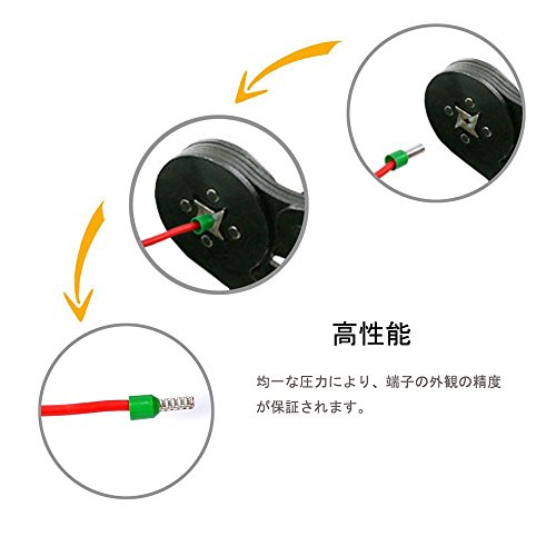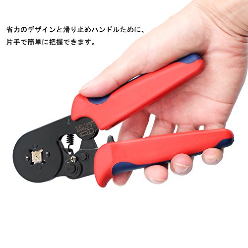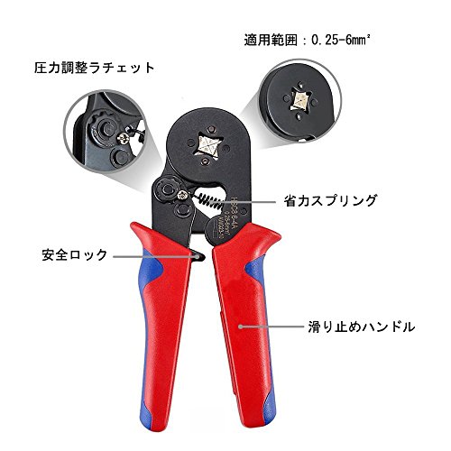 Proster 圧着ペンチ フェルール圧着工具 0.25-6mm²調整可能 10-24AWG 仕様: 用途:フェルール端子 圧着範囲:0.25-6.0mm² AWG:24-10 長さ:175mm 特徴: 絶縁・非絶縁用チューブ式端子 均一な圧力により、圧力ラインの外観の精度が保証されます。 四面方形圧着構造で、端子、フェルールなどの表面を綺麗に切断できます。 端子の要求に応じて、切断面の面積は自動的に調整され、操作が簡単です 優しい操作性。所要握力をおさえ軽い力で圧着操作が可能になります。 DIN標準に合わせてのロック装置(解除可能)により、正確なクリンプシールを保証できます。 商品の部品は硬化した特殊鋼をを採用します。 パッケージ: 1×圧着工具0.25-6.0mm²
