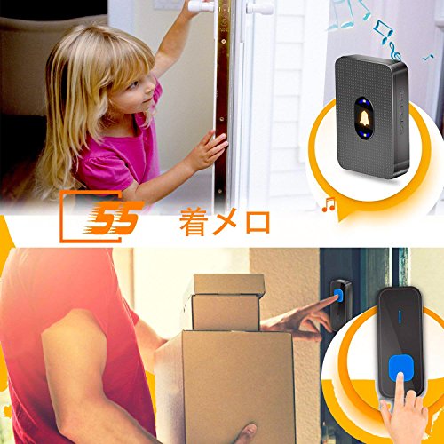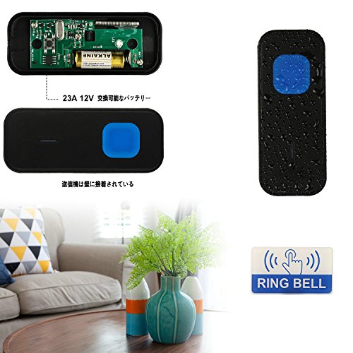 - 【シンプルな取り付け】 - 受信機を差し込んで、ベルプッシュを(付属)両面粘着テープでつまみ、仕上げます。ワイヤレス・ドアベル・送信機・システムはシームレス・ジョイント、IP-55防水、屋外での使用にも対応しています。厳しい天気の心配もありません。各送信機、1つ以上の受信機で使用できます。