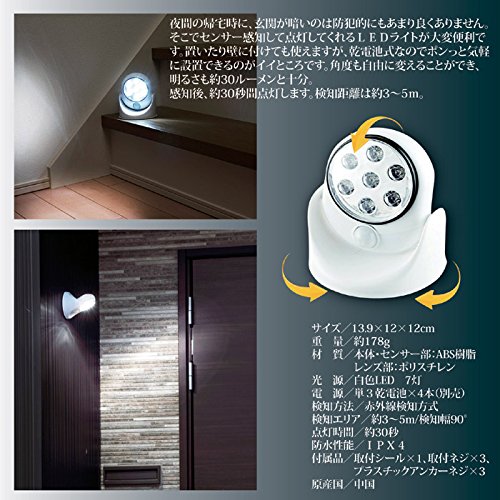 - 検知方法:赤外線検知方式 検知エリア:約3~5m/検知幅90° 素材: 本体・センサー部/ABS樹脂 レンズ部/ポリスチレン 光源:白色LED7灯 電源:単3乾電池×4本(別売) 点灯時間:約30秒