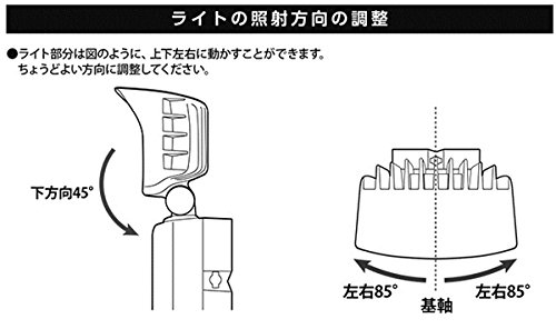 - 初期動作の確認をし、センサーの検知エリアの範囲と点灯の向きを調整するテストモードもあります。 付属のセンサー調整カバーを使用すれば検知範囲を縮小できます。 クランプ設置もできます(付属)。 保護等級:IP44だから屋外設置も可能です。
