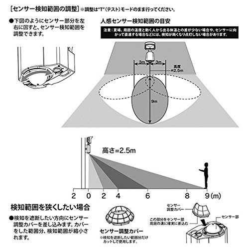 - 電源:100V 50/60Hz 消費電力:約24W(待機電力…約1W) 全光束:約2200ルーメン 使用光源:高輝度LED(交換不可) センサー検知範囲:距離…前方9m、両側3m(高さ2.5m) センサー検知方式:焦電型赤外線方式