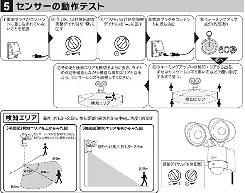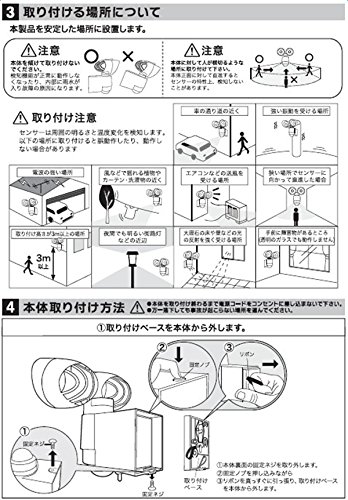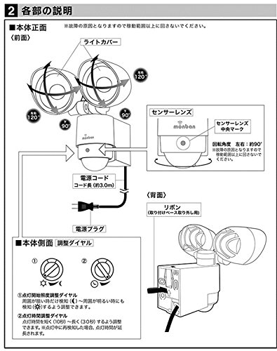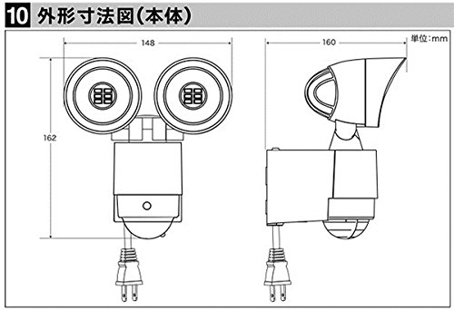 - 検知方法:赤外線受動式 使用電源:AC100V 50/60Hz 消費電力:約9W(待機時 約1W) 光源:白色LED 明るさ(約):480ルーメン