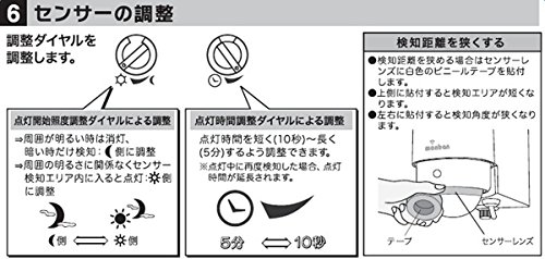- 白色ボディで外壁にマッチします 雨に濡れる場所で使用できます。(IP44) 点灯開始照度・点灯時間の調整ダイヤル付きです。 点灯開始照度:昼でも点灯〜夜だけ点灯 点灯時間:10秒〜5分