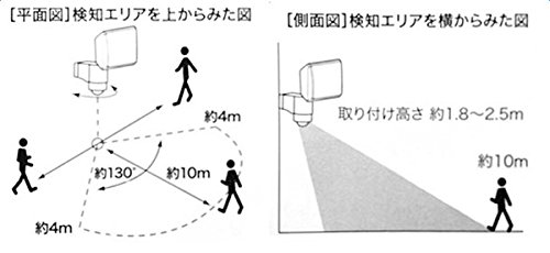 - センサー検知エリア 高度:約1.8〜2.5m 検知距離:最大約10m(中央) 角度:約130° ※角度はセンサーの中心から左右約90°に検知エリアを回転させることができます。