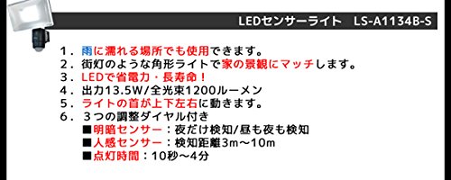 - 点灯開始距離調整…人が近くにいる時だけ検知(−)〜人が遠くにいる時にも検知(+) 点灯時間調整…点灯時間を短く(−)10秒〜長く(+)4分 赤外線センサーで人を検知し、ライトが点灯します。 光源は白色LEDを27個使用した大型照明です。 ライトの首が上下左右に動き、お好みの位置を照らすことができます。 (左右:各65° 上:65° 下:40°)